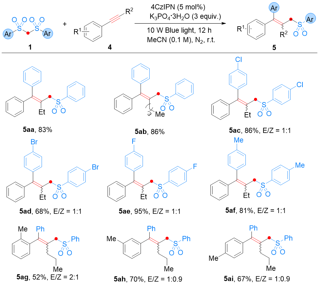 基于烯烃底物的研究基础,课题组进一步探索将该双砜试剂介导的二官能化策略拓展至炔烃底物,以期构建合成价值较高的全碳四取代烯烃(图4)。实验结果显示,该方法对内炔烃具有良好适用性,烷基链长度对反应活性的影响可忽略不计:四取代烯烃产物 5aa与5ab的分离产率分别达到83%与86%。带有电子给体或电子受体基团的双砜试剂均能有效参与反应,以良好产率生成相应烯烃产物(5ac-5ai);空间效应同样在炔烃反应体系中体现,例如产物5ag因底物位阻较大导致产率偏低。值得注意的是,该反应的立体选择性较差,推测可能是由于反应条件下烯烃产物发生光异构化所致。此外,当以烷基炔烃与端炔烃为底物时,反应在标准条件下均无法进行,未检测到目标产物,表明当前策略在炔烃底物适用范围上仍存在局限性。