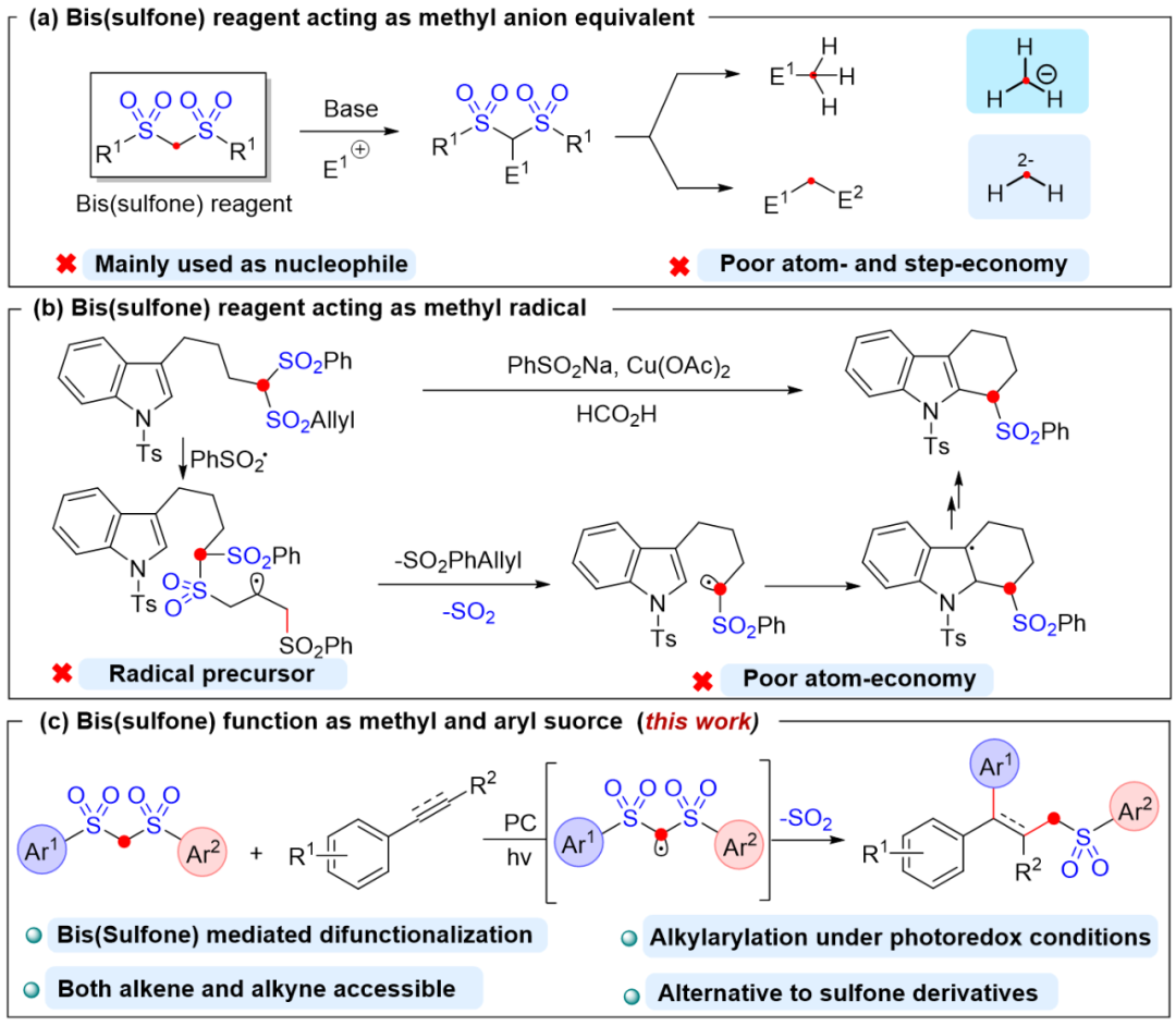 尽管双砜试剂类试剂的应用已取得显著进展,但长期以来存在一个关键问题:在多数反应体系中,双砜试剂分子中的磺酰基通常以化学计量副产物的形式被丢弃,导致反应原子效率偏低,与可持续绿色化学及原子经济性的核心原则相悖。因此,开发双砜试剂类试剂的新型活化策略与应用方式,是当前有机合成领域的重要研究方向。