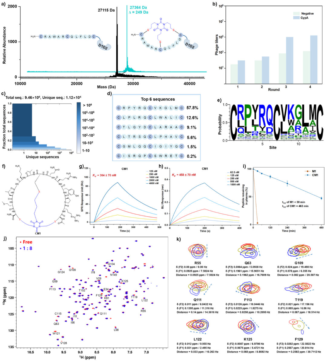随后,作者将这一方法应用于噬菌体展示相关实验中。首先,通过MALDI-TOF MS验证了在表达的融合pIII蛋白上进行的环化反应的可靠性。接着,构建了一个包含十个随机氨基酸(CX₅CX₅C)的噬菌体展示线性肽文库,并利用巯基–烯烃光点击化学进行了环化。针对疾病相关靶标蛋白CypA,作者进行了多轮淘洗,最终通过二代测序得到了富集的多肽序列。随后,利用表面等离子共振(SPR)和生物膜层干涉(BLI)技术,对富集的两条线性多肽及其环肽的亲和力进行了测定。结果表明,环肽CM1相比线肽M1,具有显著提高的结合亲和力,达到364 ± 70 nM,并且展现了较好的稳定性,半衰期为463分钟。为了进一步探究CM1与CypA的相互作用,作者使用了¹⁵N标记的CypA进行¹H-¹⁵N-HSQC NMR滴定实验,结果显示CM1结合于CypA的活性口袋。这些结果突出了巯基–烯烃光点击化学构建的双环肽在高效且选择性靶向治疗相关蛋白方面的潜力。