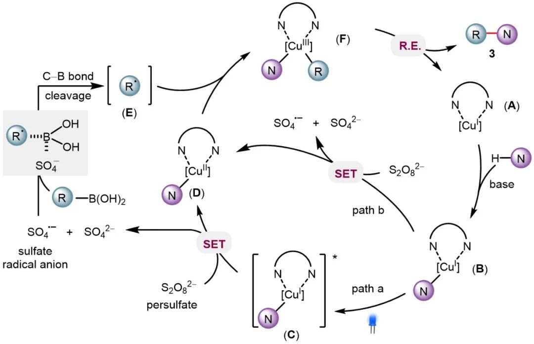 机理研究可见,基于氧化氛围实现脱硼自由基化,辅以Cu催化,辅以氧化单电子转移实现Cu(III),继而还原消除实现C-N键构建。