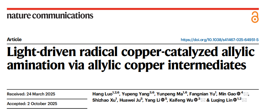 Light-driven radical copper-catalyzed allylic amination via allylic copper intermediates. Luo, H.; Yang, Y.; Ma, Y,; Yu, F.; Gao, M.; Xu, S.; Ju, H.; Li, Y.; Wu, K.; Lin, L. Nat. Commun., 2025. 16, 10425,
