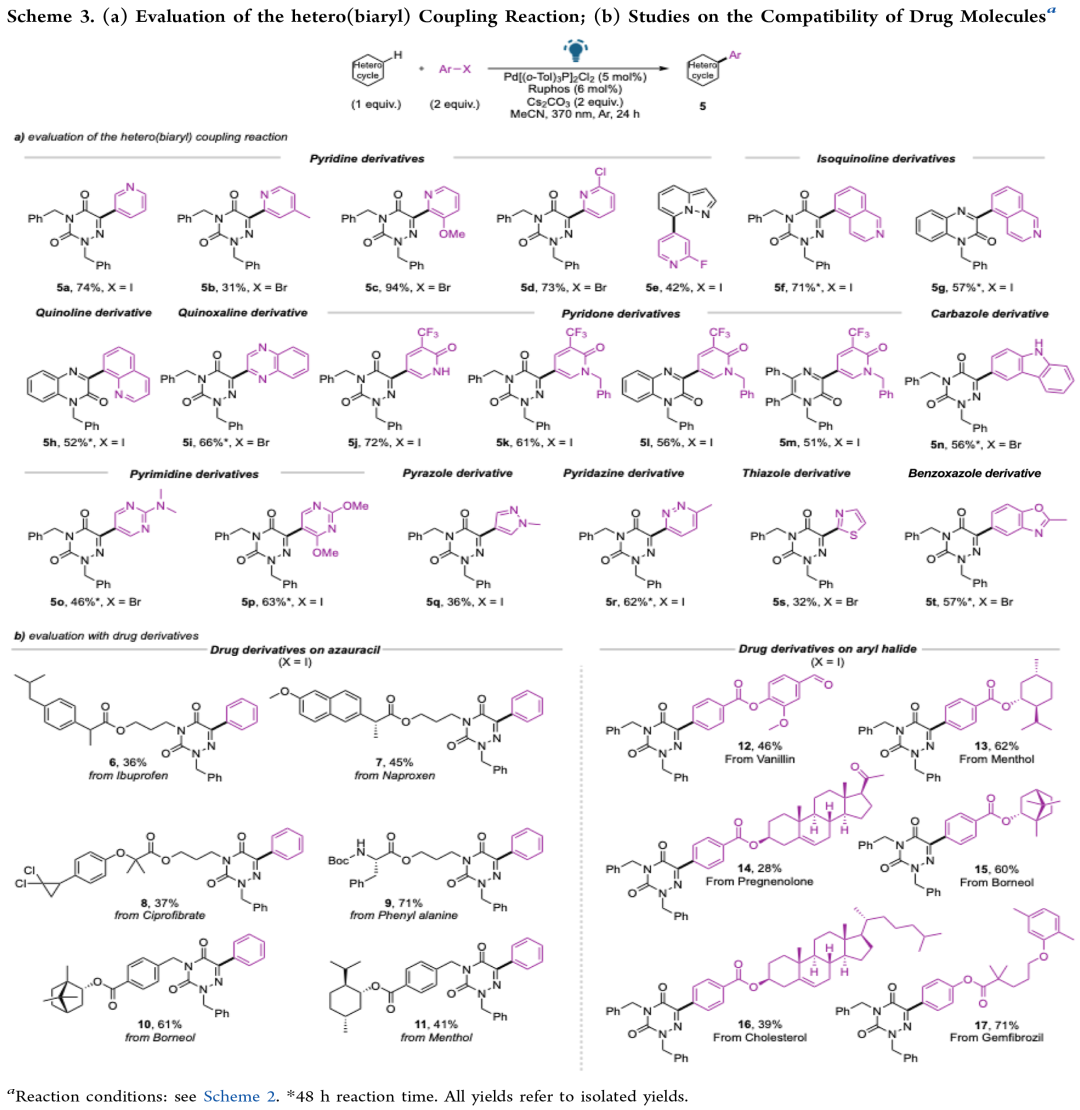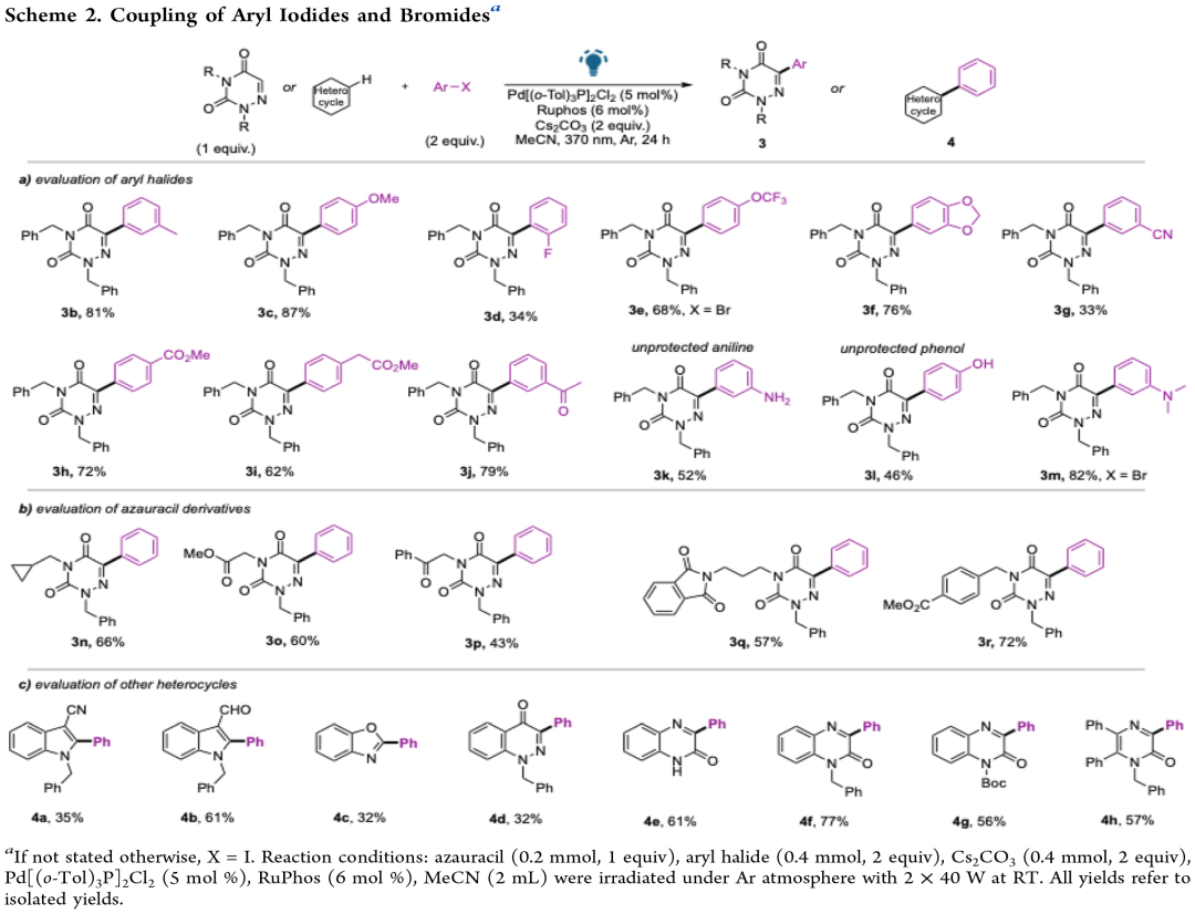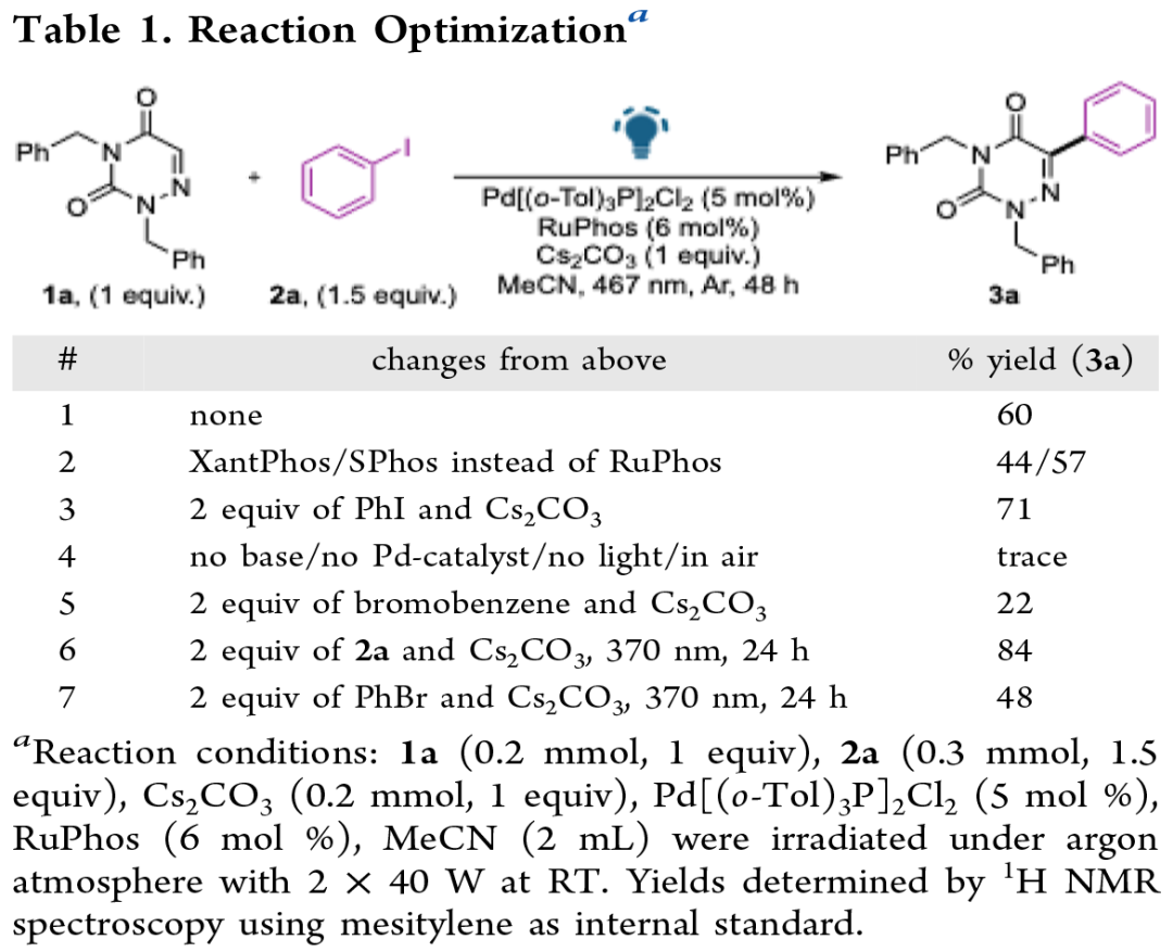 首先,作者以氮杂尿嘧啶衍生物1a与碘苯2a作为模型底物,对反应条件进行了大量的筛选(Table 1)。筛选结果表明,当以Pd[(o-Tol)₃P]₂Cl₂作为催化剂,RuPhos作为配体,Cs₂CO₃作为碱,370 nm的紫色LEDs作为光源,MeCN作为溶剂,在室温下反应,可以84%的收率得到产物3a。