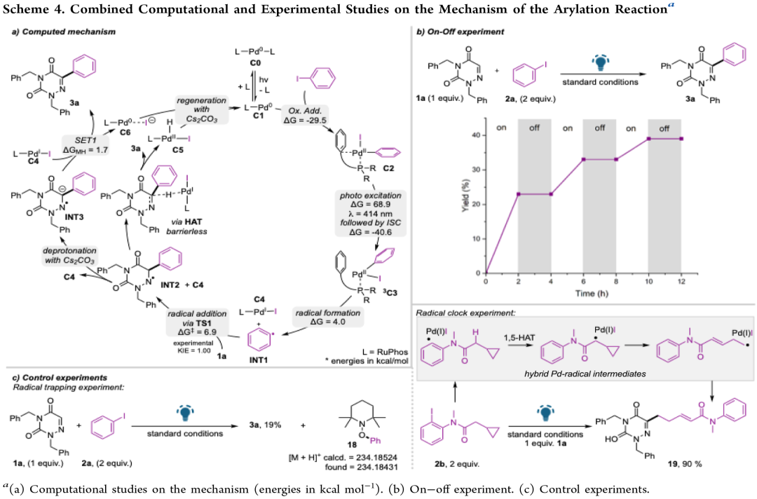 随后,作者对反应的机理进行了研究(Scheme 4)。自由基捕获实验以及自由基钟实验结果表明,反应涉及芳基自由基的形成过程(Scheme 4c)。KIE实验结果表明, C−H键的断裂不是速度决定步骤。光开关实验结果表明,钯催化剂需要持续光活化作用才能维持反应进行(Scheme 4b)。基于上述的研究以及相关的理论计算的研究,作者提出了一种合理的反应机理(Scheme 4a)。首先,在370 nm光照下,Pd(0)配合物C0的光激发作用促使配体解离,生成单配位Pd(0)配合物C1。配合物C1与芳基碘化物经氧化加成反应,生成Pd(II)-芳基配合物C2。配合物C2经光激发以及系间窜跃(ISC)过程,生成三重态配合物³C3,其通过进一步的自由基形成过程,从而生成芳基自由基中间体INT1。其次,中间体INT1与1a进行自由基加成,涉及过渡态TS1,生成自由基中间体INT2。同时,生成的自由基中间体INT2可根据其与C4的相互作用经历两种不同反应路径:当二者空间邻近时,即可发生氢原子转移(HAT)过程,得到产物3a和C5;若未满足空间条件,则经Cs₂CO₃作用发生去质子化生成中间体INT3,再通过单电子转移(SET)过程最终形成目标产物3a和C6。在两种路径中,基态Pd(0)催化剂C1均经Cs₂CO₃作用实现再生,从而完成催化循环的过程。