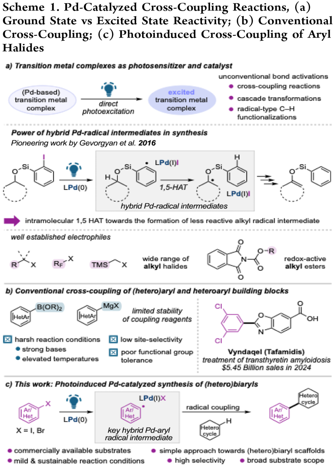 可见光照射下的过渡金属催化技术,已成为推动传统热条件下无法实现的合成方法的强大策略。其特点在于使用兼具光敏剂与催化剂双重功能的过渡金属配合物,消除了对单独的光敏剂和催化剂组分的需求。在众多金属体系中,钯因其可参与光诱导单电子过程的能力而备受瞩目,该过程与经典的双电子Pd(0)/Pd(II)催化路径形成互补(Scheme 1a)。钯配合物的这些激发态反应路径可在异常温和的条件下引发非常规的键活化过程,包括自由基型C−H键官能团化、交叉偶联及串联转化。自Gevorgyan团队的开创性研究以来,光诱导钯催化领域已迅速拓展。研究表明,光激发的钯配合物能够活化多种亲电试剂(包括烷基卤化物或氧化还原活性酯),从而在温和条件下实现多样化的自由基型成键反应,其中主要集中于以烷基自由基作为偶联底物(Scheme 1a)。相比之下,在光诱导钯催化下,直接使用芳基卤化物进行分子间芳基化反应的研究仍远未成熟。目前,大多数涉及芳基自由基的实例均通过分子内的HAT,导致自由基转位和形成反应性较低的烷基自由基。然而,(杂)芳基卤化物参与的直接自由基偶联反应,仍具有挑战。此外,杂环化合物的直接C−H芳基化是一类极具合成价值的转化。然而,常规钯催化体系通常需要苛刻条件、强碱环境和高温,且常面临位点选择性问题。同时,当偶联两种不同的(杂)芳基单元时,硼酸或Grignard试剂等偶联试剂的有限稳定性及其对敏感性官能团的耐受性差,从而进一步增加合成(杂)联芳基化合物的难度(Scheme 1b)。为了解决上述问题,近日,德国亚琛工业大学Rene M. Koenigs等课题组开发了一种光活化钯催化体系,实现了杂环化合物的自由基C−H(杂)芳基化反应,合成了一系列(杂)联芳基化合物,涉及使用简单的(杂)芳基卤化物作为易得的芳基自由基源(Scheme 1c)。该反应在温和且操作简便的条件下进行,具有广泛的底物适用性,同时展现出优异的位点选择性与卓越的官能团耐受性。
