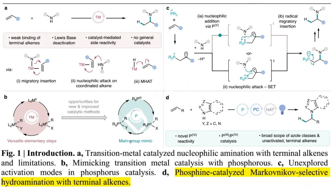 以烯烃和胺为起始原料的氢胺化反应(Hydroamination),是构建C(sp³)–N键重要方法。通过N–H键对不饱和碳碳键的形式加成,能够在氧化还原中性条件下高原子经济性得到产物。后过渡金属催化的烯烃氢胺化反应,相关研究比较深入(Fig. 1a)。但未活化末端烯烃参与的分子间马氏选择性(Markovnikov)氢胺化反应,尚未有通用催化方法报道(10.1021/acs.accounts.3c00141),特别是以药物化学常用唑类化合物为氮源的反应案例尤为有限。这是因为唑类化合物易与过渡金属发生配位导致金属催化剂失活,或发生诸如唑类化合物氧化加成等非理想副反应。