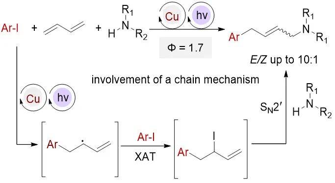 本研究成功开发了一种光诱导铜催化1,3-丁二烯芳胺化反应,通过"过量二烯作为自由基捕获剂"、"苯甲腈溶剂与过量二烯协同抑制氢原子转移"倾向于形成烯丙基碘/三价铜中间体,有效解决了芳基自由基参与反应的关键难题。该方法为烯丙基胺的合成提供了新途径,其涉及的烯丙基碘自由基链式过程也为开发无过渡金属催化体系提供了新思路。