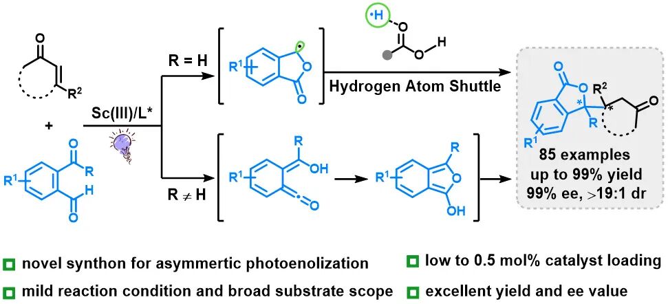 尽管关于芳香羰基化合物的光异构化机制已有一定研究,但基于OPA与OBBA的光化学转化反应却鲜有报道,在不对称构建手性苯酞方面的应用更是一片空白。基于此,四川大学冯小明课题组设计并实现了OPA/OBBA与缺电子烯烃的光致环异构化/不对称共轭加成串联反应,高效高选择性(99%收率,>19:1 dr,98% ee)获得了一系列传统方法难以获得的单取代/双取代手性苯酞衍生物。