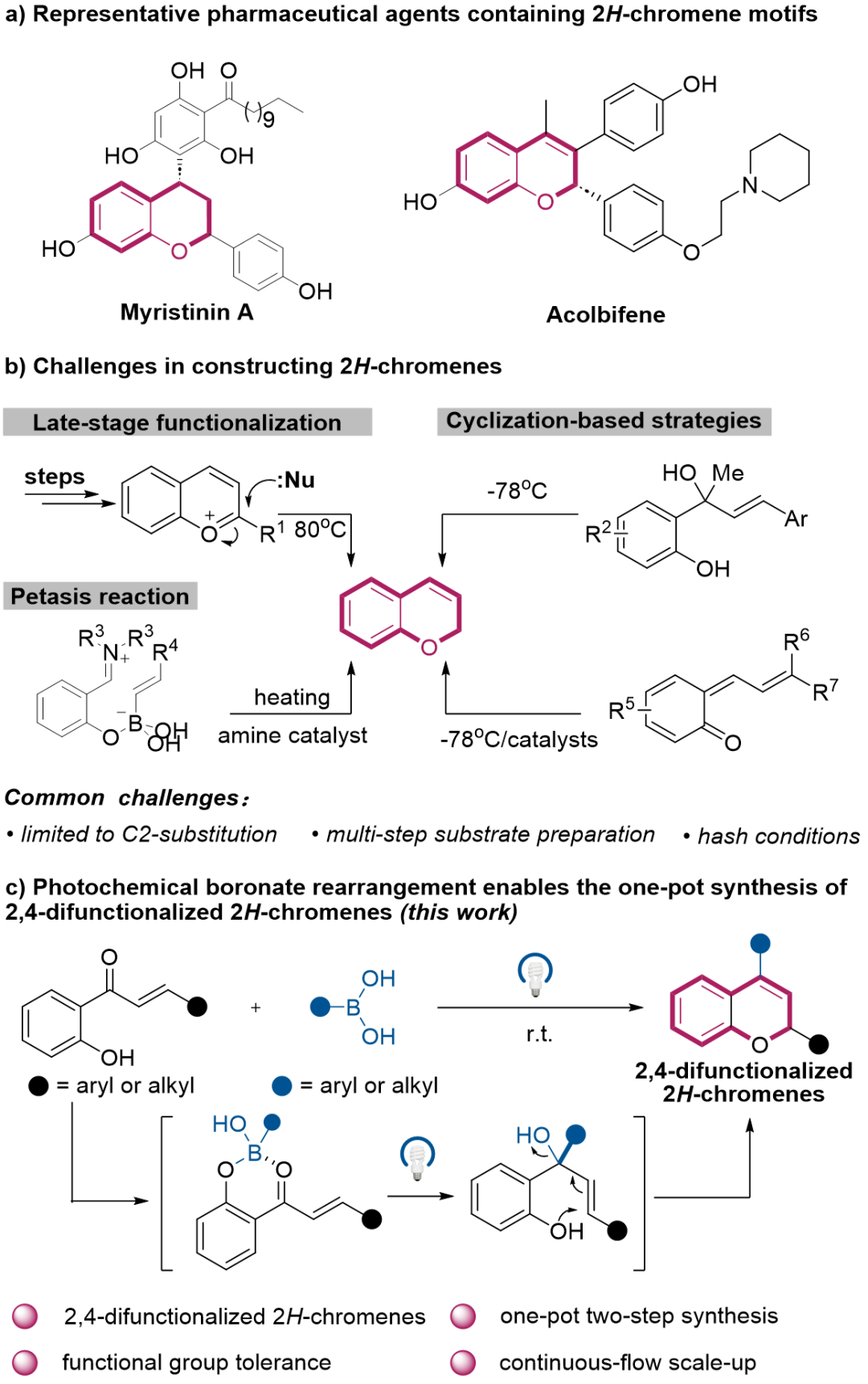2H-色烯(2H-chromene)是一类广泛存在于天然产物与药物分子中的杂环骨架。代表性分子如具有抗真菌及DNA聚合酶β抑制活性的Myristinin A,以及用于乳腺癌治疗的选择性雌激素受体调节剂Acolbifene,充分彰显了该类骨架在药物研发中的重要地位。然而,自然界中官能化2H-色烯的资源十分有限,因此开发高效、模块化的合成方法成为有机合成化学领域的一项重要课题。